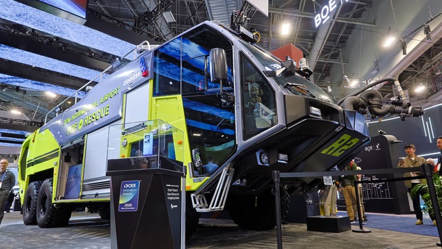 Na edição de 2026, um dos equipamentos que mais chamou atenção foi o Oshkosh Striker Volterra Performance Hybrid, um caminhão de bombeiros aeroportuário de 45 toneladas. Projetado para atuar em incêndios de grande escala, especialmente envolvendo aeronaves, o veículo se destacou não apenas pelo porte, mas pelo conjunto tecnológico que permite operação completa por apenas uma pessoa.