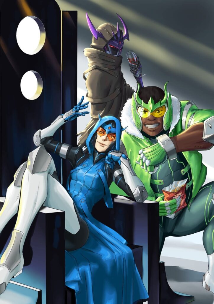 A HQ brasileira Blue Ghost apresenta uma narrativa inspirada no gênero tokusatsu, trazendo como protagonistas os chamados “fantasmas”, uma ordem de vigilantes criada para manter o equilíbrio no universo. Esse manto é passado de geração em geração e cada distrito possui seu próprio representante.