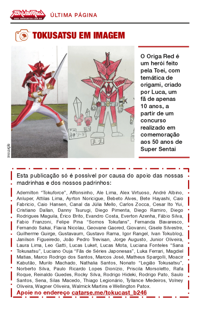A sexta edição da Tokuniverso, a revista digital do Tokusatsu.com.br, já está disponível para os apoiadores do Tokucast no Catarse e para os assinantes da Digital Comics. A revista traz artigos, matérias sobre tokusatsu, diversas seções e detalha tudo o que aconteceu da primeira notícia sobre o fim da franquia Super Sentai na imprensa japonesa até o anúncio oficial.