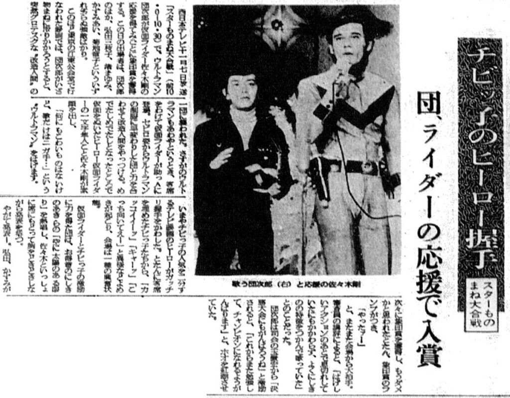Um encontro inusitado ocorreu em 31 de outubro de 1971 (transmitido em 7 de novembro para retransmissoras como a TV Nippon) no palco do programa Zoshirushi Star Monomane Daigassen (象印スターものまね大合戦), ou Grande Batalha de Imitação de Estrelas Zojirushi, que tratava-se de um programa de auditório musical produzido pela emissora de TV NET (atual TV Asahi), cujo formato reunia estrelas de diversos gêneros da época, como atores, apresentadores e cantores, divididas em equipes. Os participantes interpretavam imitações (ou, em alguns casos, dublagens) de canções de outros artistas, sendo avaliados por um corpo de jurados.