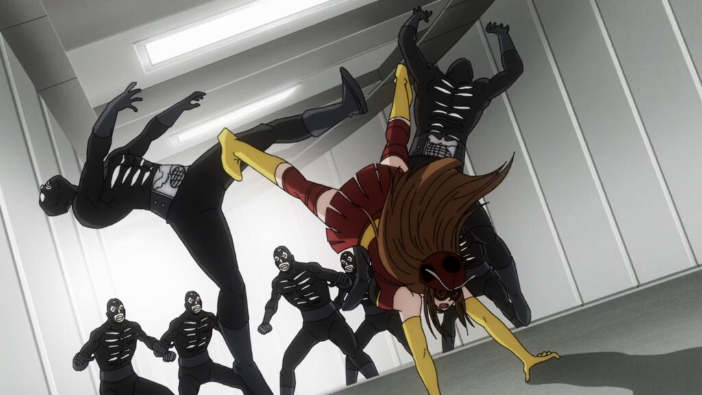 As duas guerreiras então travam uma batalha feroz, marcada por trocas intensas de socos e chutes. Tackle se assusta com o poder de Raiko, que chega a quebrar a viseira e parte do capacete da heroína. No entanto, quando a vilã tenta aplicar um golpe finalizador, Yuriko reage e reverte a situação com seu Arremesso Eletro-Onda Supremo, derrotando Raiko.
