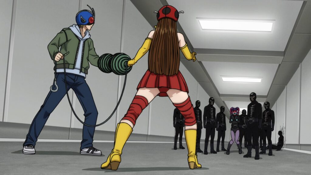 Enquanto isso, o plano dos Riders segue em andamento. Para interromper o show das Combat Girls no Tokyo Dome, eles ativam o alarme de incêndio, forçando a evacuação do público. O Koumori Otoko ordena que suas lacaias ataquem, mas Tojima (Kamen Rider) e Ichiyo (Kamen Rider V3) entram em ação, surgindo do teto e executando um Rider Kick duplo, que o derruba imediatamente. O episódio se encerra com o vilão assumindo sua forma kaijin, revelando uma aparência ainda mais assustadora, enquanto Kumota (Homem-Aranha) observa à distância.