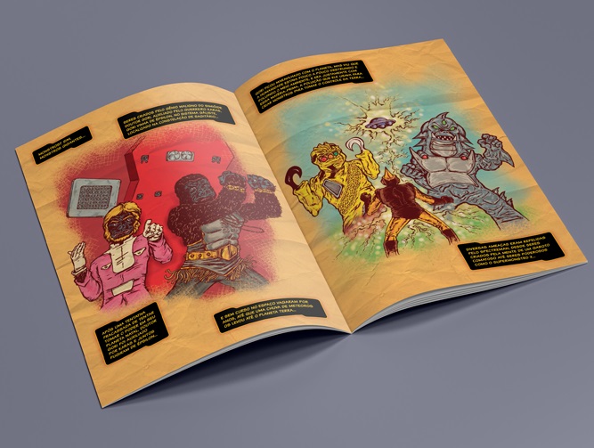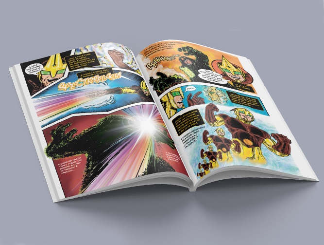 E é justamente esse amor pela série que pulsa em cada página da HQ. Alexandro não tenta reinventar Spectreman, mas respeitar sua essência. A história começa como uma grande carta de amor à infância, resgatando a clássica narração da série, a televisão de tubo, o “Tecnicolor” e toda a atmosfera nostálgica de uma geração. A partir daí, constrói uma continuação moderna, conectando a temática ecológica da série original com um novo desastre ambiental causado por décadas de descaso humano.