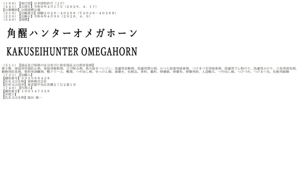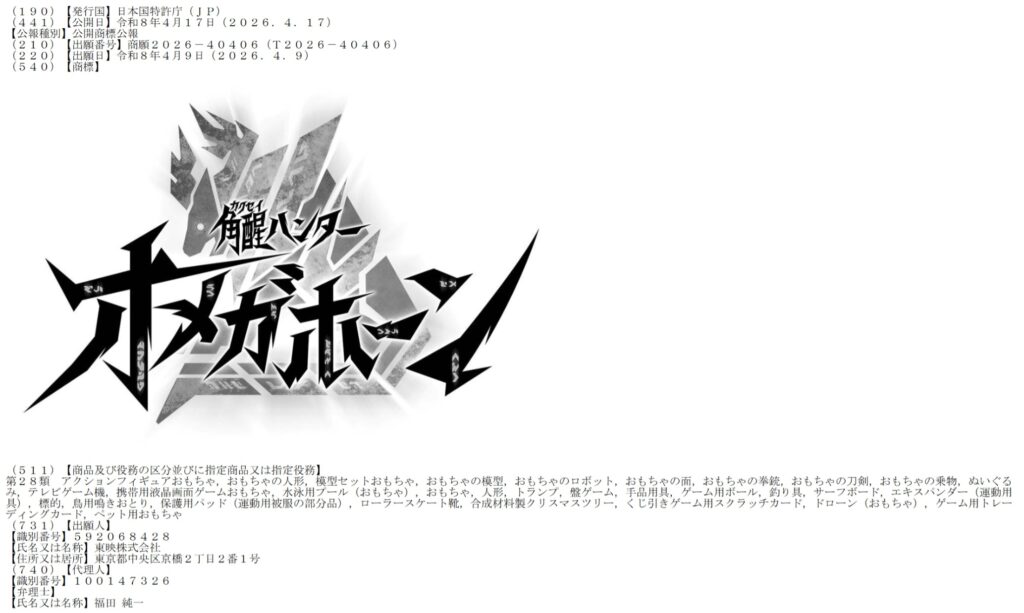 A Toei Company realizou o pedido de registro da marca Kakusei Hunter Omegahorn (角醒ハンターオメガホーン), incluindo também seu logotipo oficial. As solicitações foram registradas sob os números 2026-40268 a 2026-40286 e 2026-40406, segundo o @trademark_bot no X (antigo Twitter).