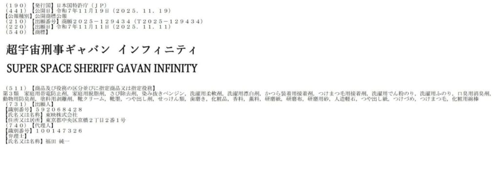 A Toei Company registrou a marca Super Space Sheriff Gavan Infinity (超宇宙刑事ギャバン インフィニテ, Chō Uchū Keiji Gavan Infinity). O anúncio veio em 18 de novembro, por meio do Boletim Oficial de Marcas do Japão. A Toei solicitou proteção em múltiplas categorias, incluindo entretenimento, brinquedos e mercadorias, o que é padrão para novas produções de tokusatsu. O registro se alinha aos rumores de elementos desses heróis em uma provável série substituta da franquia Super Sentai.