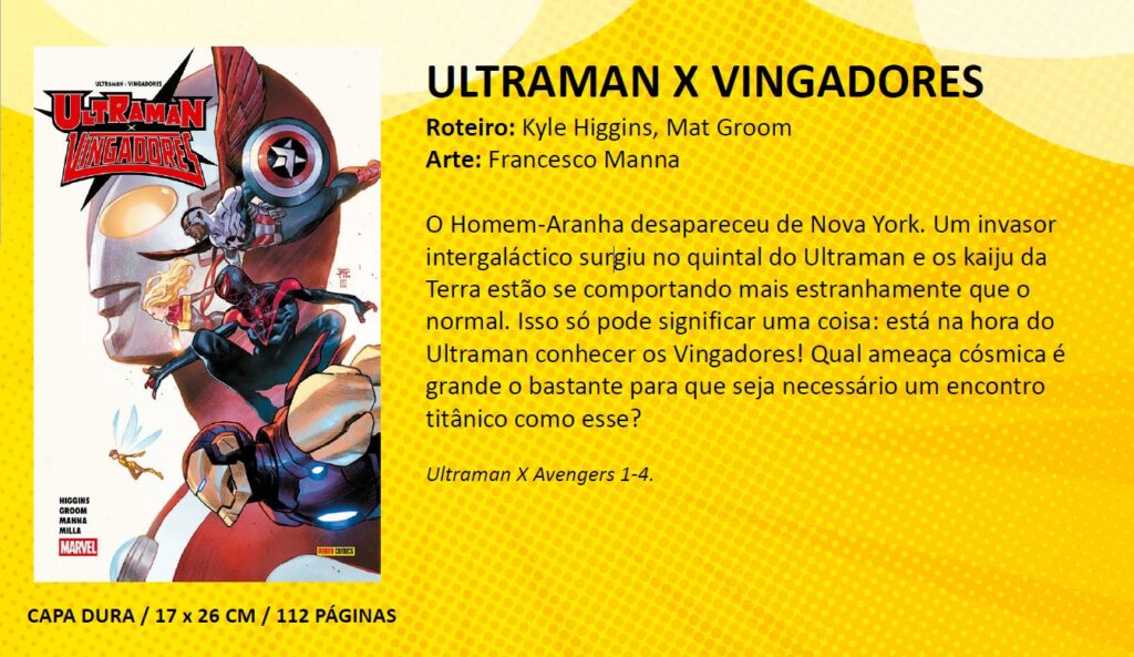 A Panini iniciou a pré-venda de Ultraman VS Vingadores, minissérie de quadrinhos em quatro edições publicada originalmente em 2024 pela Marvel Entertainment em colaboração com a Tsuburaya Productions. A história é coescrita por Kyle Higgins (Mighty Morphin Power Rangers, Avengers Origins: Vision) e Mat Groom (Mighty Morphin Power Rangers, Immortal Legend Batman), com arte de Francesco Manna (Absolute Carnage, Fantastic Four: Life Story). A obra funciona como sequência direta de “O Mistério de Ultraseven”, escrita majoritariamente pela mesma equipe.